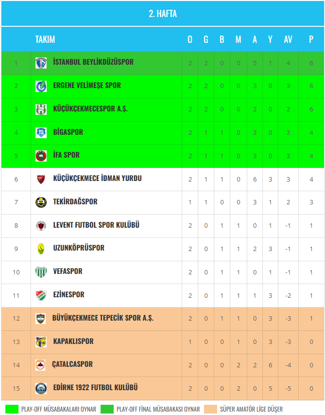hafta sonunda alınan sonuçların ardından puan tablosunun zirvesi de şekillenmeye başladı. İlk üç sırayı İstanbul Beylikdüzüspor, Ergene Velimeşe Spor ve Küçükçekmecespor paylaştı.