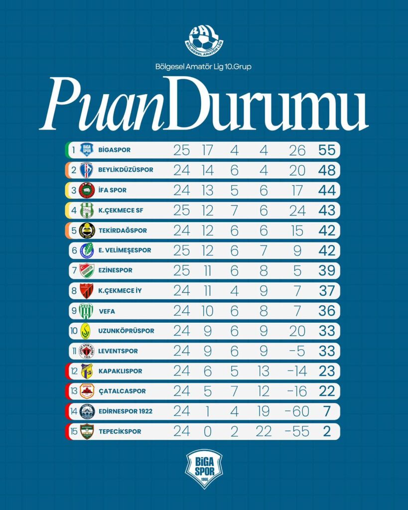 Alınan galibiyetle birlikte Bigaspor, ligde kritik bir virajı daha kayıpsız geçti. Şampiyonluk yolunda artık son 3 haftaya girilirken, her puanın önemi daha da arttı.