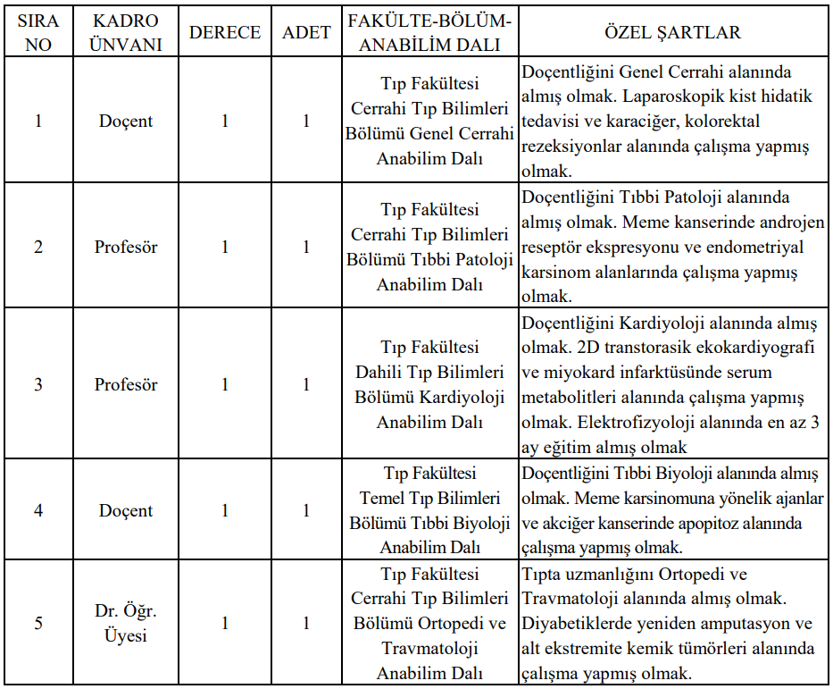 Tıp Fakültesi: Genel Cerrahi, Kardiyoloji, Ortopedi ve Travmatoloji, Kadın Hastalıkları ve Doğum, Tıbbi Biyoloji, Tıbbi Patoloji, Tıp Tarihi ve Etik, Fiziksel Tıp ve Rehabilitasyon.